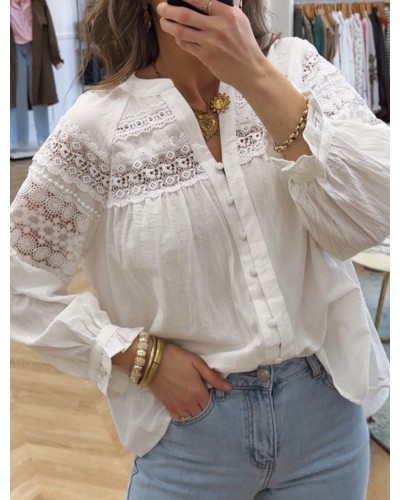 Nouveau Quick view Supprimer du panier Liste de souhaits Comparer BLOUSE KALY Prix 36,00 € - Blouse blanche - Col v - Manche loose - Bouton sur le devant - Dentelle crochet - S=36, M=38, L=40 - 100% coton Chariot