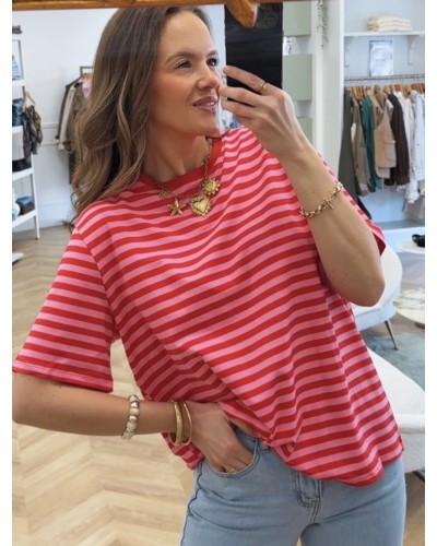 Nouveau Quick view Supprimer du panier Liste de souhaits Comparer TSHIRT RAYE Prix 24,90 € - Tshirt loose - Rayure horizontale - Manche courte - Existe en rouge/rose ou vert/rose - TU 34-42 - 100% coton Chariot